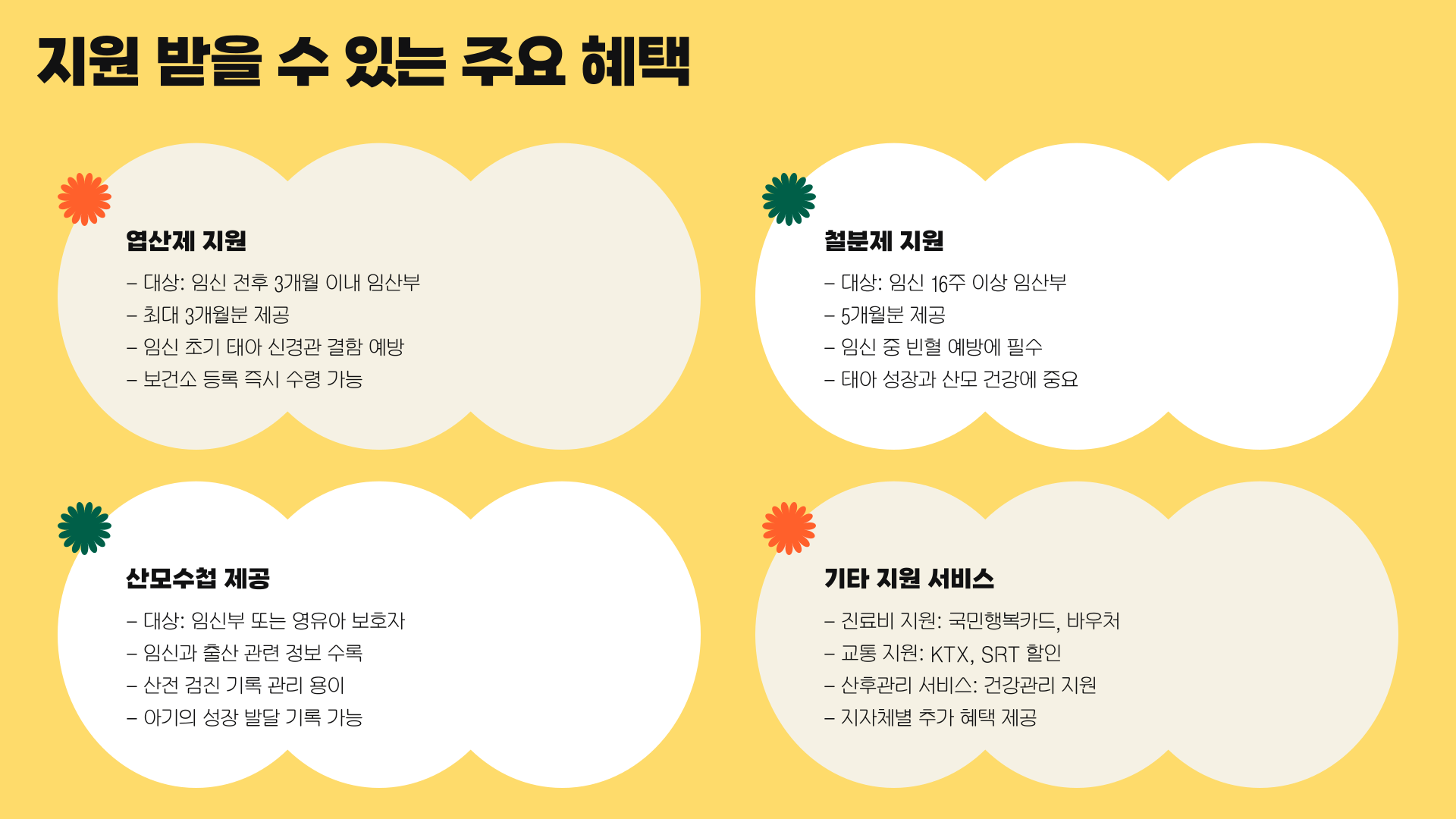 맘편한 임신 서비스로 받을 수 있는 혜택은 생각보다 다양하답니다. 그 중에서도 제일 중요한 건 엽산제, 철분제, 그리고 산모수첩이죠! 아래 표로 정리해볼게요.