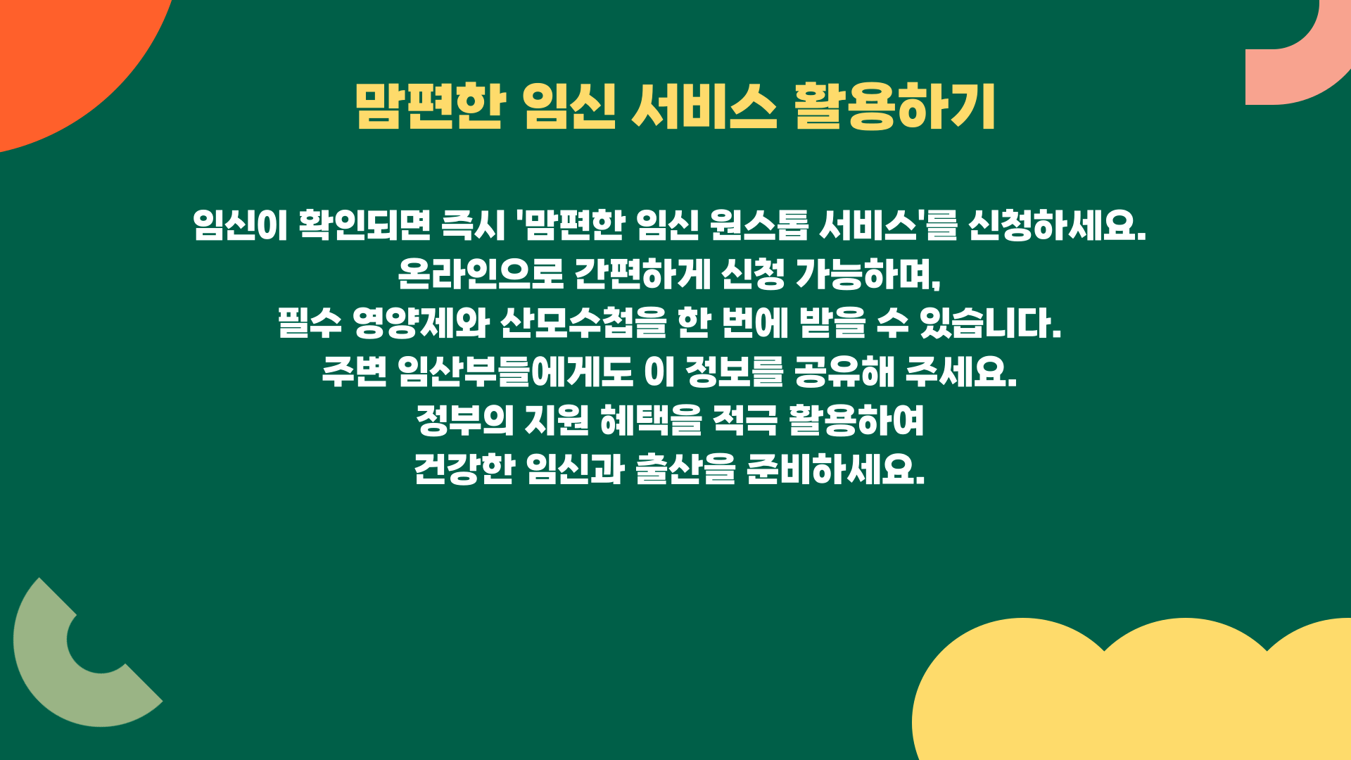 이번에 소개해드린 ‘맘편한 임신 원스톱 서비스’는 진짜 말 그대로 ‘맘 편한’ 서비스였어요. 신청도 간단하고, 집에서 택배로도 받을 수 있고, 필요 서류도 딱 기본적인 것만 준비하면 끝! 이 정도면 모든 임산부가 한 번쯤은 꼭 이용해봐야 하지 않을까요?